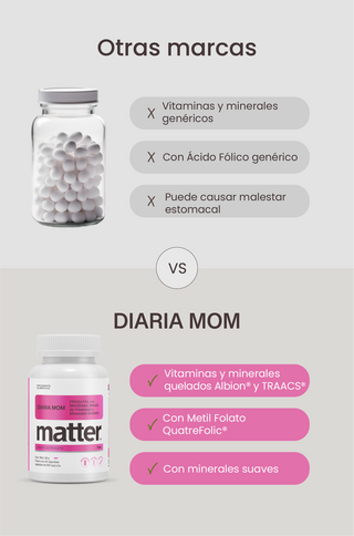 Diaria Mom es un prenatal integral para antes y durante el embarazo, con metilfolato y vitaminas y minerales quelados, pensados para una mejor absorción y fácil digestión.